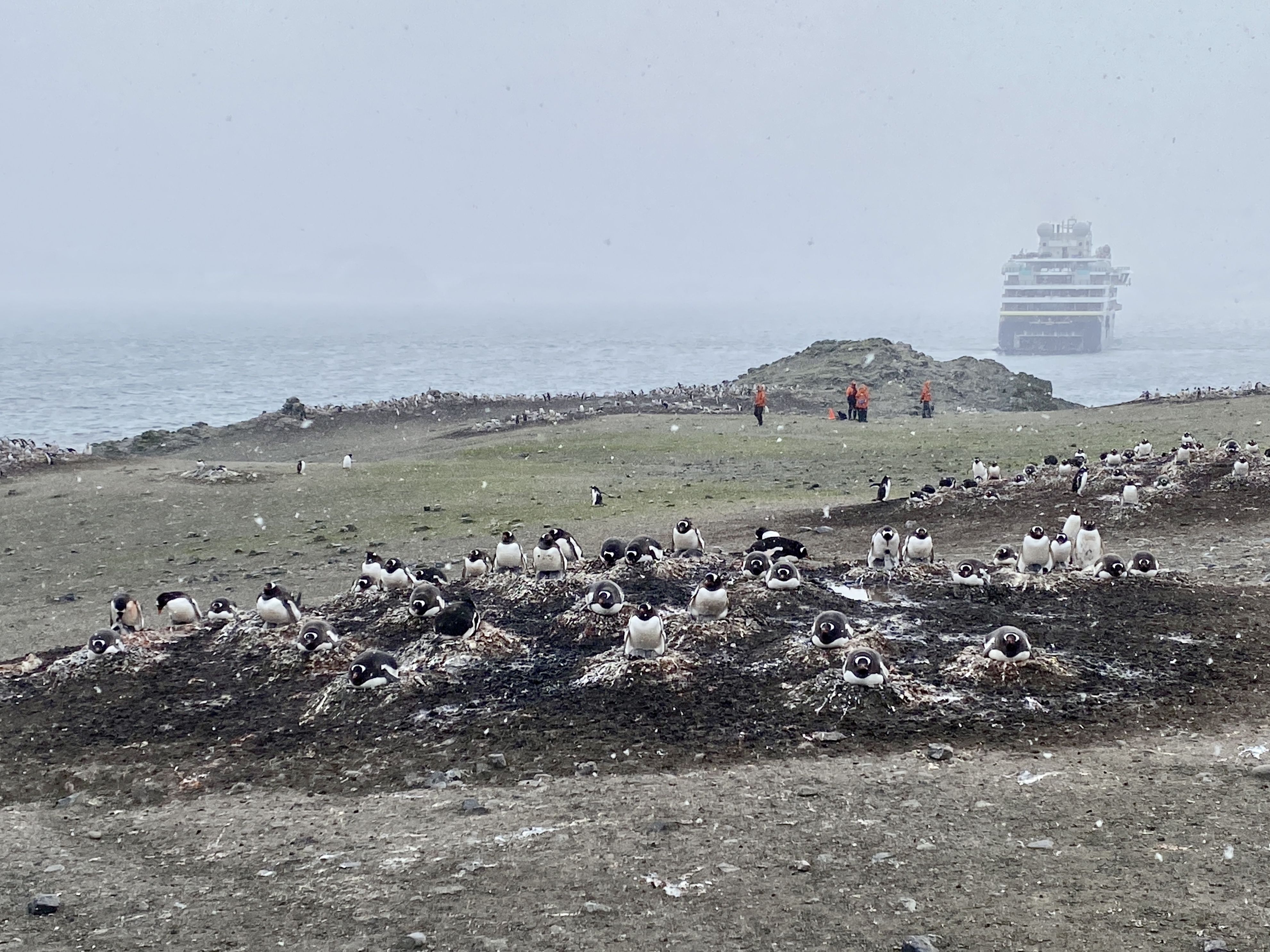 This day was like a cherry on the top of a cake for the entire expedition. In the morning, our ship approached Deception Island, which has one of two active volcanoes in Antarctica. In fact, the entire island represents leftovers of a gigantic volcano that violently erupted about 10,000 years ago creating an underwater caldera (a blast hole) in the central part of the volcano. So, the island represents a rim of land around the caldera bay and resembles a horseshoe in outline. We had to land outside of the caldera bay on the tops of large swale waves. Thousands and thousands of busy chinstrap penguins greeted us both during our approach to the landing and on land, where dramatic wind-carved sculptures sat on an impressive cliff made of countless volcanic ash layers. We hiked for about 1.5 kilometers maneuvering among nesting sites of penguins. Around 50,000 chinstrap penguins nest in this area. Many curious penguins came directly to our feet and had their portraits recorded on numerous cameras. Chicks were still very young and had gray baby plumage. From time to time, we saw brown skuas and giant petrels among penguin colonies. These birds of prey were looking for lunch. Geology of the site was as impressive as the bird life. Despite the island’s short geological history (this volcano and the island appeared only 1.5 million years ago), we saw plenty of evidence of geological events. An Ice Age glacier completely buried the island under a thick layer of ice and as it moved, it bulldozed volcanic deposits leaving very smooth hills behind and depositing new hills of morainic material. After the thick continental glacier melted, small valley glaciers kept doing their job of “eating” mountain slopes and creating cliffs along the directions of their movement. New eruptions covered the results of the glaciers’ work with new layers of volcanic ashes sprinkled with volcanic debris. The wind helped create this dramatic landscape, blowing black sand and dust around and depositing black dunes. Finally, penguin activity created a dense network of eroded trails that over thousands of years added their own contribution to the landscape relief. After everyone was back aboard, the captain sailed our ship into the caldera bay. Over there, we could see remains of a whaling station from the beginning of the 20th century and remains of scientific stations abandoned after the eruption of 1970. Along the shoreline, we could see areas with steam coming up, indicating that the volcano is just having a nap but not yet sleeping. The rest of the day National Geographic Resolution was set on crossing the Drake as this was our last day in Antarctica. Goodbye, land of the sparkling ice! After dinner, guests enjoyed a crew show that featured many talented singers, musicians, and magicians.