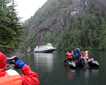 We awoke at 5:30 in the morning to be greeted by a pod of transient killer whales as we made our way aboard National Geographic Sea Bird into the entrance of Dundas Bay, part of the 3.4 million acres that make up Glacier Bay National Park in Southeast Alaska. After dropping anchor, we ate breakfast and prepared for a full morning of kayaking near the mouth of the bay, bush-whacking through a dense forest of Sitka spruce and yellow cedar, and following the tracks of moose, brown bear, and wolves along the mudflats that make up the eastern side of the bay. The weather was overcast, cool, and just right for spotting wildlife, which included a brown bear cruising the shoreline, hundreds of young otters rafted up in the kelp beds, and a lone harbor porpoise that seemed to be overly curious about our boat. Before lunch, Lindblad Expeditions’ Global Explorers embarked on their own Zodiac for a lesson in plankton sampling and driving a 60hp engine by hand.