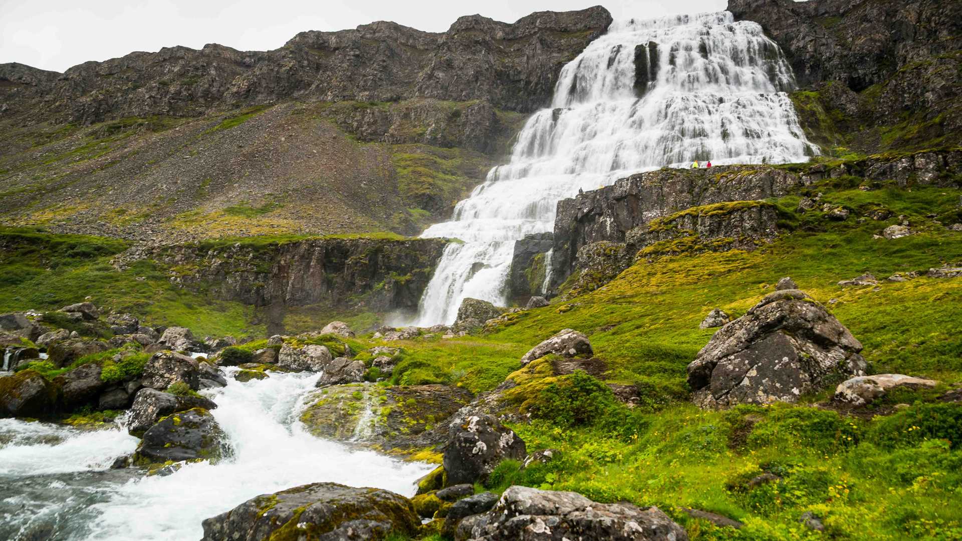National Geographic Explorer was at anchor in the North arm of Arnarfjöƌur and the majestic sight of Dynjandi Falls was just off our bow. This spectacular waterfall, meaning “thunderous” spills from the basalt cliff in a wide swath of frothing meltwater necking down with each successive plunge over the basalt terraces left by the volcanic activity that formed this island making it arguably one of the most beautiful in all of Iceland. This morning we set out to hike up the trail alongside this marvel obtaining stunning views as each tier was reached, seven in total. To remind us that we were in the wilds and not some movie set, small companions in the form of midges swarmed around our heads, not biting but merely making their presence known. Our expedition team offered kayaking as an option to explore this remarkable setting to take advantage of the calm conditions and mild temperatures. Kayakers also were afforded the opportunity to get a closer look at the falls on foot, either before or after their paddle.