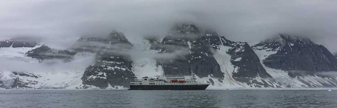 As morning broke, the skies finally cleared for a moment, providing a nice break from the fog. Large icebergs scattered along the coastline of East Greenland as we made our way towards Nansen Fjord to the south. Global Perspectives Guest Speaker Bob Bindschadler gave a compelling presentation on the reality of “Earth’s Bipolar Disorder.” He addressed climate change and its causes and dangers, as well as real solutions for an improved, sustainable future. How ironic that our afternoon’s destination was changed due to Nansen Fjord being choked with ice! Nonetheless, we pressed on, heading south as National Geographic photographer Dan Westergren regaled us with stories and photos from his time spent skiing to the North Pole. One can only imagine the physical and mental determination it must have taken to clamber over mountainous pressure ridges of ice in skis―nonetheless taking photos while doing so! The stunning photographs of his adventure gave us all an appreciation for the gorgeous yet harsh Arctic conditions.