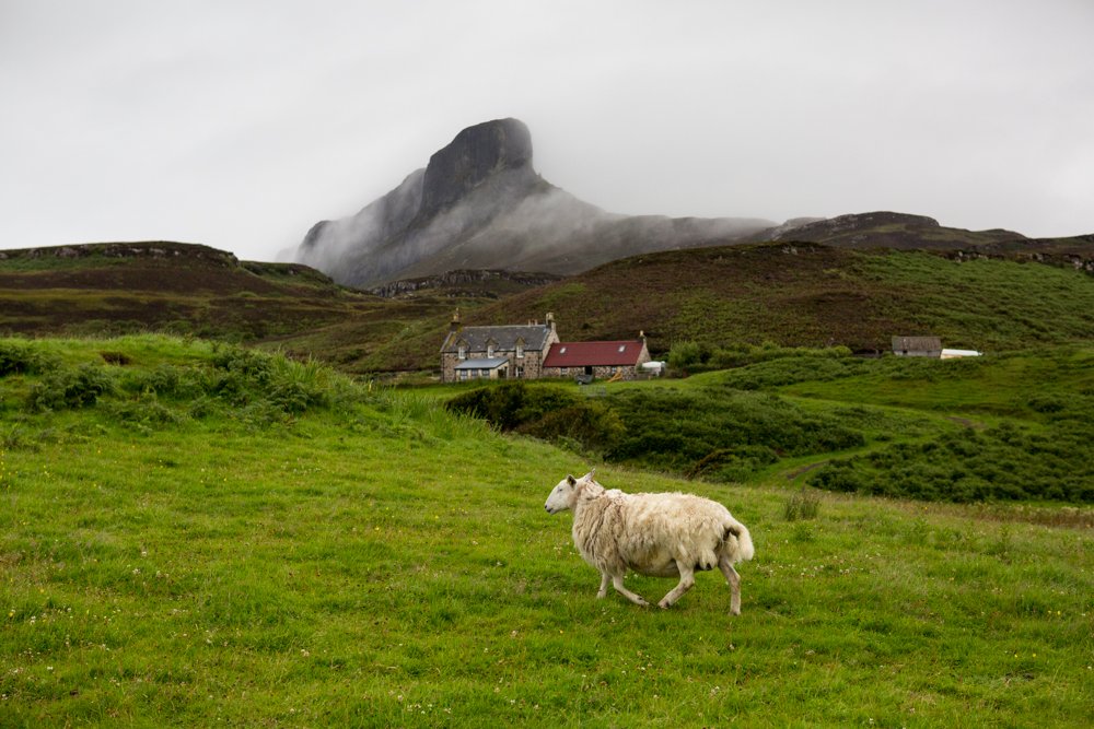 We arrived on the Isle of Eigg as rain and mist lowered, hiding An Sgurr, a prominent rocky peak that dominates the island’s skyline. An Sgurr (Gaelic for “The Rocky Crag”) was formed around 50 million years ago during a volcanic period. A flow of lava filled an ancient riverbed and the surrounding rock subsequently eroded down, leaving the peak as it stands today. A group of hikers set off towards the peak, reaching a viewpoint below the hidden cliffs. As the walkers returned down, An Sgurr emerged from the clouds, giving a fantastic view of the dark cliffs draped in strands of mist.
