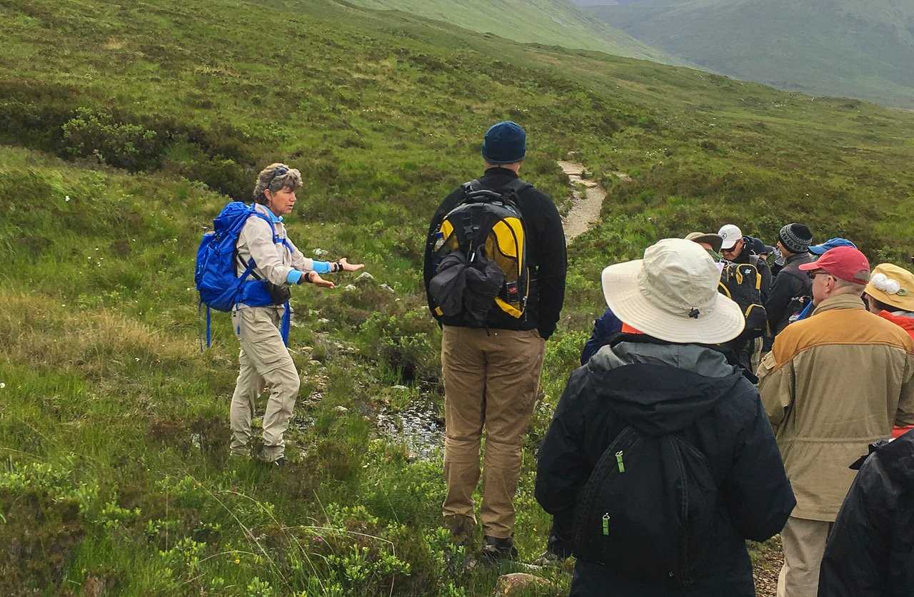 The hiking group traveled across the Skye Bridge through the increasingly rugged terrain of the Isle of Skye to reach Sligachan Glen. There we walked up a glacially carved valley between the Black Cuillins and the Red Cuillins, named for their igneous rock types, the black composed of dark gabbro, the red of reddish granite. Both are remnants of an underground magma chamber exposed through the grinding action of Ice Age glaciers and erosion. The dramatic peaks provided a wonderful setting for our walk through the moorland, with its peat bogs and heather. The summer flowers are just beginning to bloom: bog asphodel, lousewort, tormentil, orchids, and bell heather. The insectivorous plants, sundew and butterwort, also grow along the trail.