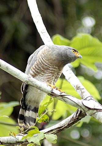 In the afternoon, we had plenty of time to explore far and beyond Yanalpa Caño. A very strong tropical sun marked the beginning of our adventure. Little by little, dark rain clouds covered the area, and we had a constant tropical rain during the rest of the outing. We had several interesting sightings, like a curious roadside hawk that we could observe at an unusual close range, and a beautiful Amazon bushed-tailed rat. The latter mammal, with its round eyes and sweet appearance, helped to erase the bad press and undeserved negative image given to all rodents by their city cousins. We experienced firsthand the extraordinary biodiversity of the rainforests, and the sudden climate changes that are typical of this ecosystem. After a while, the rain stopped and we were able to explore the shores of the Ucayali River. There is a section of this river in the vicinity of Yanalpa Caño, where many dead palm trees can be seen. These trees make up homes for many colorful birds, and we observed many parrots and macaws coming back to overnight in the dead trees that they inhabit.