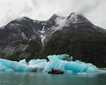 The ship proceeded far up the fjord until the density of icebergs and bergy bits halted further progress.  From a distance of 4 nautical miles from the face of the Dawes Glacier, we launched expedition landing crafts for two rounds of cruising.  The size of the glacier from the perspective of the ship made it seem that the icy façade was much closer.  However, once we continued toward the glacier in our sturdy ice-going rubber craft, the Sea Lion quickly shrank to a distant speck, and the scale of the surrounding landscape became apparent.  We cruised past expanses of recently exposed rock face left by the receding glacial ice and stopped to view a myriad of streams, gushing cascades and waterfalls from above.