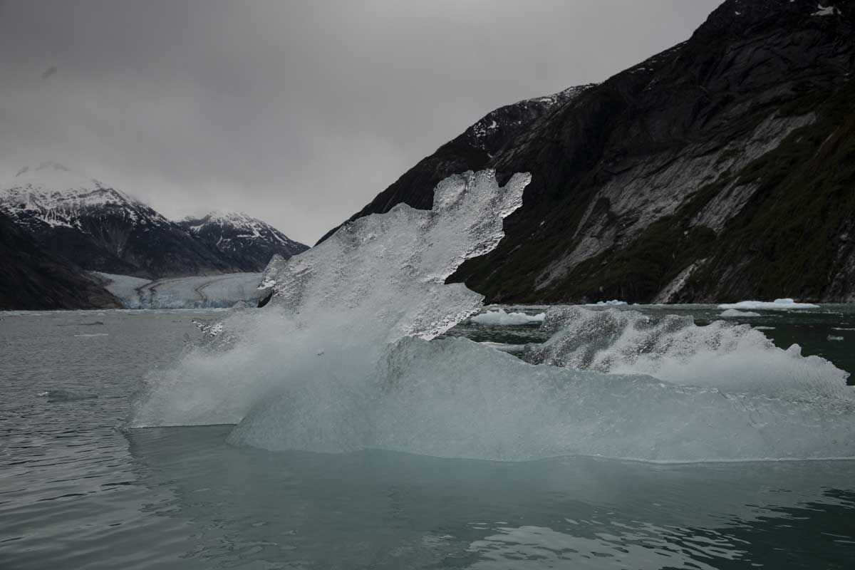By the time most of the guests awoke, the National Geographic Sea Lion was already sailing in the narrow and deeply cut glacial fjord named Endicott Arm.  As we sailed in, the established forests of spruce and hemlock gradually gave way to much younger vegetation after the glaciers had receded.  Gigantic U-shaped valleys appeared on both sides of the main fjord, betraying that once massive tributary glaciers had joined the main river of ice that ground out this spectacular passage.  From certain vantage points, we could catch views of the hanging glaciers that had receded nearly up to the ice fields while their meltwater streams gushed down the valleys of moraine and new alder forests.