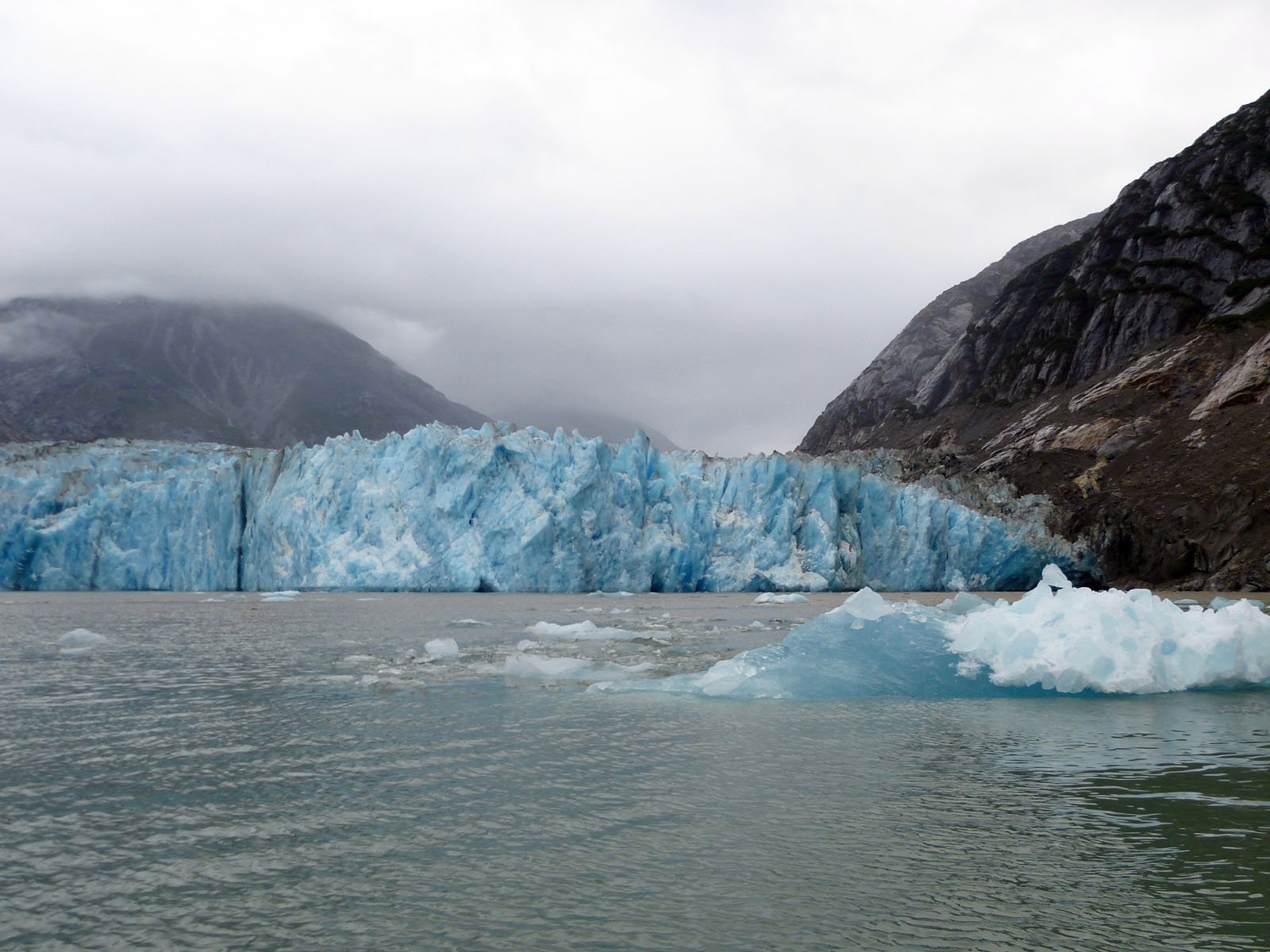 Imagine, if you will, Southeast Alaska as it was some 12,000 years ago (a mere blink of the eye in geological time.)  The continental glaciers had retreated from most of the northern part of North America, but they lingered a bit longer in Southeastern Alaska.  Virtually all of the land was under ice that formed in the mountains and flowed downhill as glaciers.  As it moved, the ice carved the landscape, leaving behind U-shaped valleys.  When the continental ice melted and glaciers retreated into the mountains, sea level rose and the deeper valleys were flooded to become fjords, the channels through which we travel on our excursion around Southeast Alaska.  Endicott Arm is one such passage.  It cuts into the mainland of Alaska, reaching almost to the border with Canada.  We passed myriad waterfalls descending down the steep granite walls of the fjord.  Icebergs floated past.  Many of them were a brilliant blue, the ice reflecting the blue end of the light spectrum.  At the head of the fjord, we found their source: the Dawes Glacier.  It was raining at sea level, but in the mountains above us, it may well have been snowing, to be transformed into more ice that will fuel the relentless downhill motion of the ice.