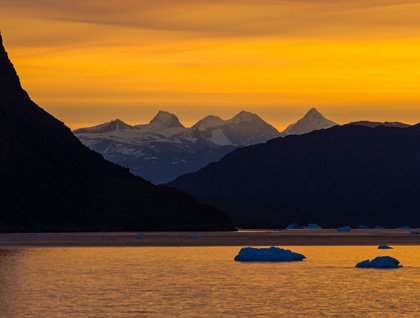 Today we are traveling in the wake of the Vikings, as the National Geographic Explorer explores Eriksfjord, a long glacier-carved fjord named for Eric the Red where Greenland’s first Norse settlement was located. Navigating 60 miles from the open ocean, a brilliant sunrise paints the water gold, broken only by blue icebergs calved from glaciers fed by ice from the Greenland icecap.