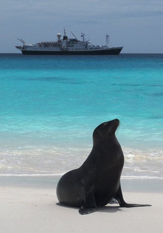Located in the southeastern end of the Galápagos archipelago, Española is one of the most interesting islands due to its landscape and wildlife. We woke up to a drizzly morning, typical of this time of the year, but despite this we could see how beautiful this area was. We were anchored at Gardner Bay, with its turquoise waters and white sandy beach. We started off by snorkeling at nearby Gardner Islet, in order to explore the underwater world. There were fantastic schools of razor surgeonfish, and other species like the parrot fish and king angel fish were also sighted. The weather soon improved and we landed at the beach, which is inhabited by some Galápagos sea lions. A dominant bull sea lion kept patrolling the length of the beach, at the same time trying to impress a few female sea lions in the vicinity. One of the most popular birds on this island is the endemic Española mockingbird. We saw several of them constantly looking for insects and plant material to eat on the sand. Many of our guests were able to relax and take a stroll on the beach, enjoying the warm air temperature, while others could explore the nearby coastline by kayak, one of the most popular activities of the week.