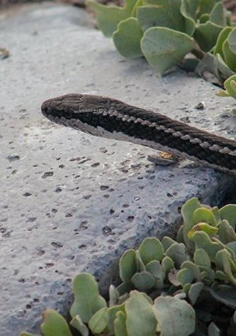 We reached a cliff where we watched the sea birds soar beside and below us. The waved albatross, a mid- sized albatross with a wing span of 6-7 feet, nest on Española and are now completing their nesting cycle. We found a few large juvenile chicks that have almost molted into their adult plumage. These birds will leave the archipelago within the month and remain at sea for several years until they are ready to breed. We saw several adult birds also, some soaring along the cliff and others on land. These are large, elegant birds. There was a bit of courting and dancing going on as the birds tried to establish a pair bond before they headed off to sea, where they will feed until March and then return to Española to mate and lay eggs.