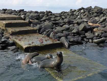 Today we anchored off the northern central coast of Española at Gardner Bay. An early kayaking outing was offered this morning. The conditions were great, overcast, warm, and the sea was calm. It was amazing to observe many young sea lions playing along the coastal area and sea birds, like brown pelicans, feeding. After breakfast our guests were briefed about our snorkeling procedures and were out-fitted. Once ready, we went to explore the underwater world under heavy rain! Nevertheless we enjoyed great snorkeling with large schools of Razor surgeon fish, king angelfish, Panamic sergeant majors and playful Galapagos sea lions!
