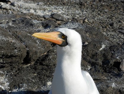 After breakfast all of the guests of the National Geographic Islander got their snorkeling equipment and were all ready for the water activities. There were two choices, snorkeling off the white sandy beach or deep water snorkeling. This morning I was in charge of deep water snorkeling at Gardner Islet.  Here we got to see large schools of Razor surgeonfish, Creoles, Sargent majors, sting rays, Pacific green sea turtles and playful Galapagos sea lions. When the sea lions are in the mood they are the best playmates and today the sea lions came very close, almost touching our faces and offering the most delightful experience. Afterwards we stopped at the ship, dropped our snorkeling gear, and went to the beach.  Gardner Beach is considered one of the most beautiful beaches of the Galapagos.  Its white powdery sand and the turquoise water are a delight and dozens of sea lions were resting while we strolled along the beach.  Curious Espanola mocking birds were observed, one landed on the cap of our guest!