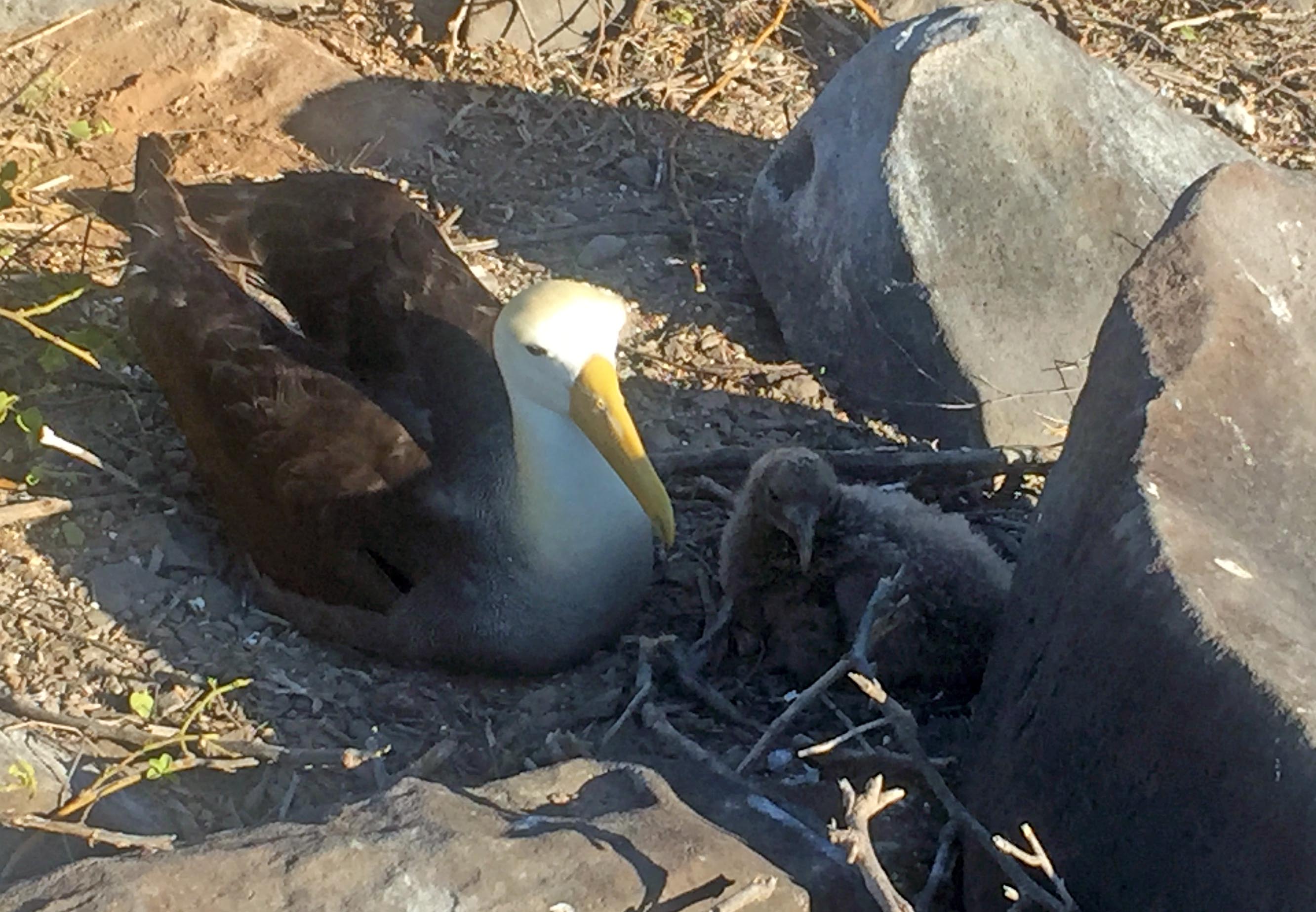 In the afternoon, after short navigation, the National Geographic Islander arrived to Punta Suarez. It was sunny but windy, making for a very refreshing walk along the trail. As soon we landed on the small pier we observed marine iguanas facing to the sun while they warmed their bodies. On the beach behind them sea lions slept indifferently. Walking inland we arrived at Nazca booby territory which was covered completely with guano. We observed some of them nesting and others walking around us producing their unmistakable sounds. We crossed the iguana’s nesting area and finally our efforts were rewarded when we arrived at the waved albatross territory. We saw juveniles with their fluffy brown feathers and many others in pairs incubating their eggs, or just resting. All the while the imposing Galapagos hawk hovered over us looking for a prey.