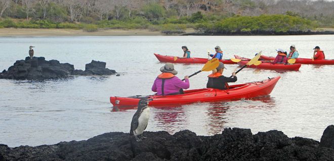 It’s our first full day of expedition on National Geographic Islander . We started our day with a morning hike on North Seymour, which is one of the best islands to observe nesting colonies of frigatebirds, blue-footed boobies, swallow-tailed gulls, and many more species of marine birds. Later in the morning, National Geographic Islander navigated to the beautiful Rabida Island, where we enjoyed an amazing afternoon. Guests swam and snorkeled with sea lions and many different species of reef fish off the red sand beach. We walked to a pond located behind the beach and observed flamingos nesting after more than 20 years on this island.