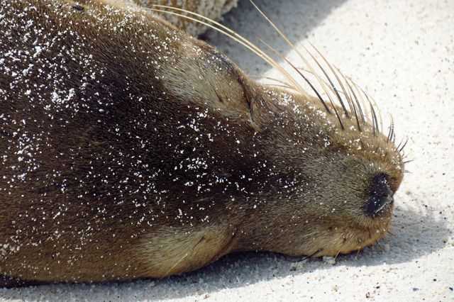 Early in the morning, we woke up already anchored at Gardner Bay, in the northeastern corner of Española Island. This is one of the oldest in the archipelago; rather low in elevation, it is obvious that fresh water is scarce here. Despite the cloudy start of the day, we could see that we were to land on one of the most beautiful beaches of the archipelago: Gardner Beach. Not far from it, a few islets offer the perfect conditions for snorkeling. This time of the year, juvenile Galapagos sea lions are always inquisitive and willing to follow any snorkeler that shows up in their domains. Once we set foot at the beach, it was simply marvelous to be able to share this stunning place with its rightful owners, the Galapagos sea lions. There is a healthy colony here, and one can never get bored of walking along the beach and observing these unique species that, like all other species in the archipelago, don’t show fear of humans. They just continue with their everyday life, and we have to keep remembering that these are indeed wild creatures living in their natural environment.
