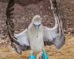 In the afternoon, our photo instructor gave an interesting talk. After a short navigation and having had some time to rest and recharge our batteries, we arrived at Punta Suarez. This visitors’ site is located in the westernmost point of Española Island. Here, the abundance of wildlife is overwhelming. We were instantly surprised by the profusion of life as we landed. Colorful green and red Española marine iguanas and many Darwin finches were seen. Many young sea lion pups were admired while playing cheerfully in the shallows. Some intrepid walkers moved farther along the inland exploring a rocky trail. High cliffs are home to many seabird species like Nazca boobies, hawks, shearwaters, red-billed tropicbirds and swallow-tailed gulls. Nazca boobies are endemic birds to the Galapagos. The waved albatross is another unique creature that inhabits the Galapagos from April to December to reproduce. We saw them practicing their intricate and well-elaborated courtship, one of the most stunning among seabirds in the world. Many of their babies were ready to get food from their parents, they feed on 5 kilograms of a very nutritious oil that allows them to grow quickly. By December, they will reach adult size and leave the island for five years.