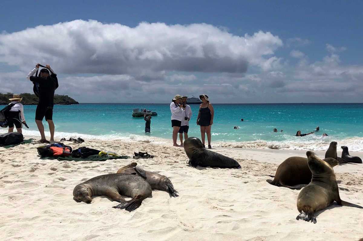 Later in the morning, we disembarked at Gardner Beach, an organic material beach. This sunny morning was perfect for a walk along the coast, where we spotted some Galapagos sea lions resting on the beach and some pups nursing from their mothers, as well as some Darwin’s finches species and the Española mockingbird, a very curious land bird kind.