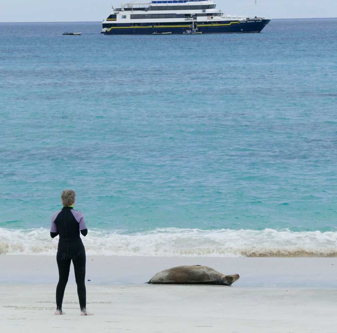After a thorough briefing about snorkeling procedures, everyone interested tried the equipment either from the beach (great way to get going if it’s been a while, or perhaps one’s first try) or from the Zodiacs into deep water – and we went snorkeling! The underwater world of Galapagos is spectacular because one never really knows what to expect (fish, mammal or reptile)! As a group, we saw all!