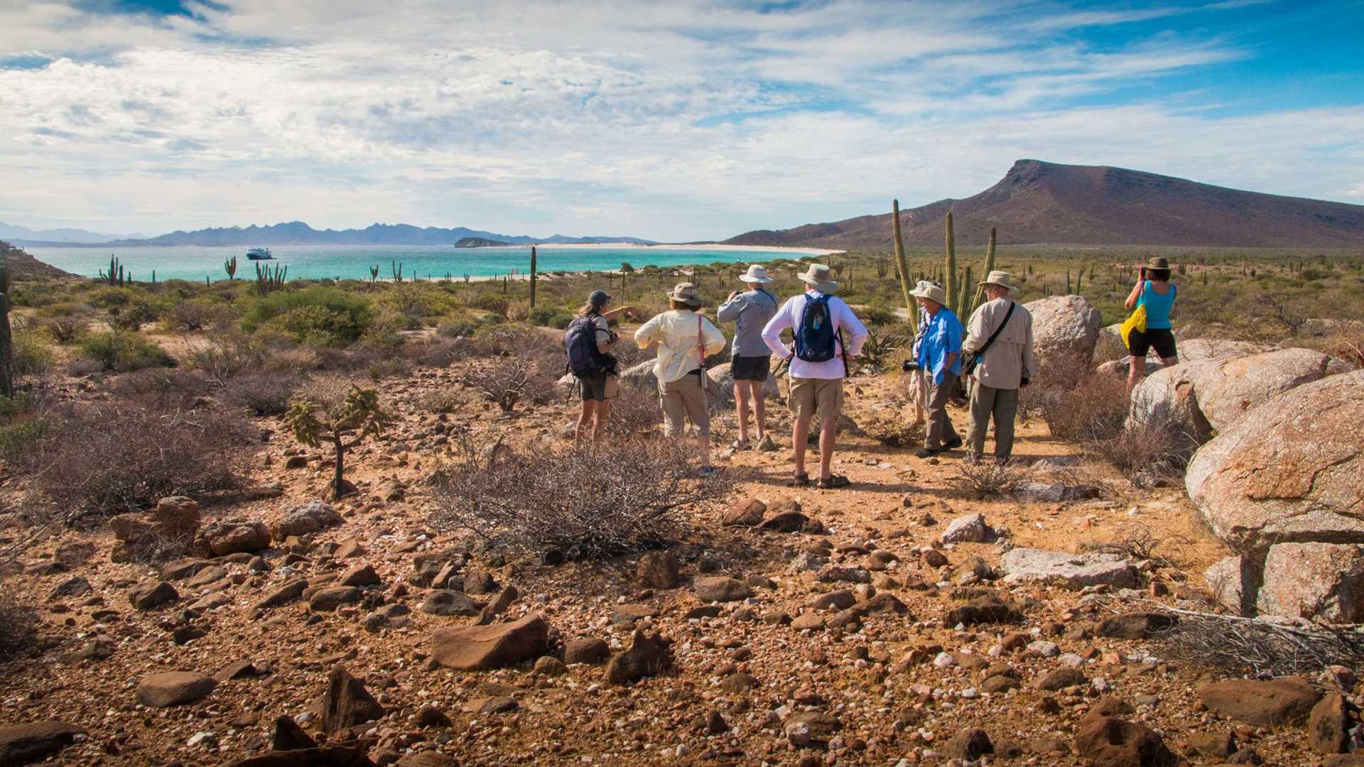 We started our day anchored off the island of Espiritu Santo in the Sea of Cortez. The morning light illuminated the starkly beautiful hills on the island. After a filling breakfast, we went to shore, landing on a gorgeous white beach. Several people went with our wellness specialist, Michelle on a long aerobic hike across the island. Others joined the naturalists for shorter walks that focused more on learning about the island’s wildlife, plants, and geology. The massive cardón cacti were among the amazing natural wonders we saw. Some of us managed to see two of Espiritu Santo’s endemic vertebrates: the black jackrabbit and the whiptail lizard. Other activities in the morning included free-form exploration and kayaking in the bay.