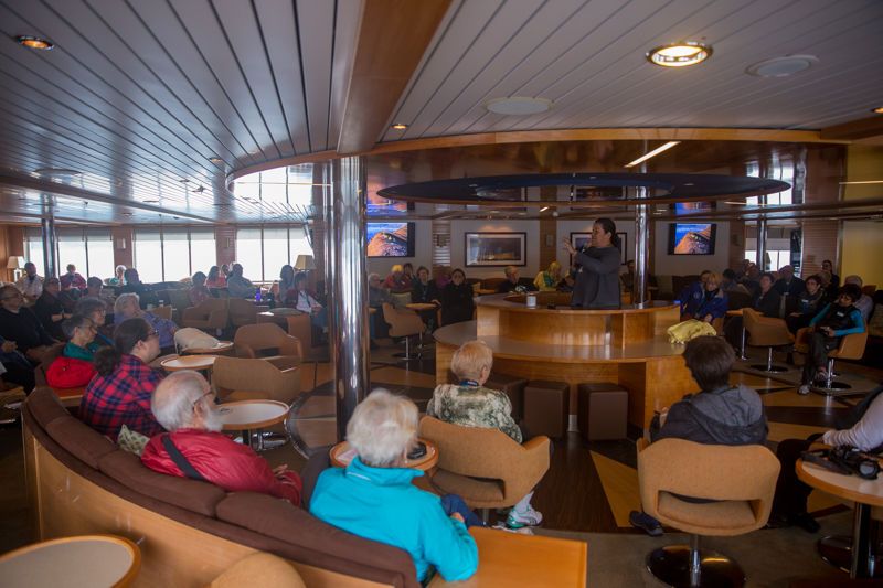 Today was almost all about icebergs. The Ilulissat icefjord is the biggest iceberg factory in the Northern Hemisphere. Bergs calved from a tongue of the Greenland ice sheet are spat into the head of this fjord—but there's a problem: A shallow hump at the mouth of the fiord catches deep-drafted bergs, locking them in an iceberg jail yard, until the irresistible force of more arriving bergs push them past. Boat tours gave guests a close-up experience of the immense icebergs at the fjord's mouth. A short hike down a boardwalk led guests to a fjord-side cliff that overlooked the iceberg prison. The Ilulissat area is home to Sermermiut, settled thousands of years ago by the Saqqaq indigenous people and one of the most important archaeological sites in Greenland. Together, history and natural wonders have earned the Ilulissat icefjord the designation of a UNESCO World Heritage site. Many guests took advantage of free time for walks in town. The dog sledding tradition is much alive in Greenland, and guests saw many of tethered dogs, waiting for their summer vacation to end and their sledding work to begin.
