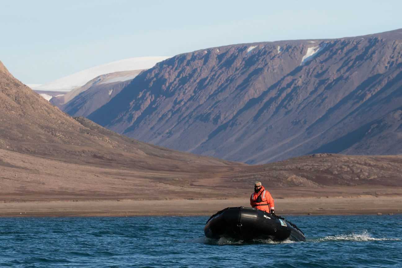National Geographic Explorer approached Fram Fjord, Ellesmere Island, on a clear, sunny morning. The striking landscape of the fjord was dominated by the contrast of the hills and valleys against a blue sea and sky. Some distant musk ox were peacefully feeding at the bottom of the valley. While some guests went ashore to explore the landing site and its surroundings, others took the opportunity to take kayaks out on the calm water and paddle around the fjord in the sun. We were surprised when the weather changed suddenly and the wind picked up, making us replace kayaks for Zodiacs in order to continue exploring.