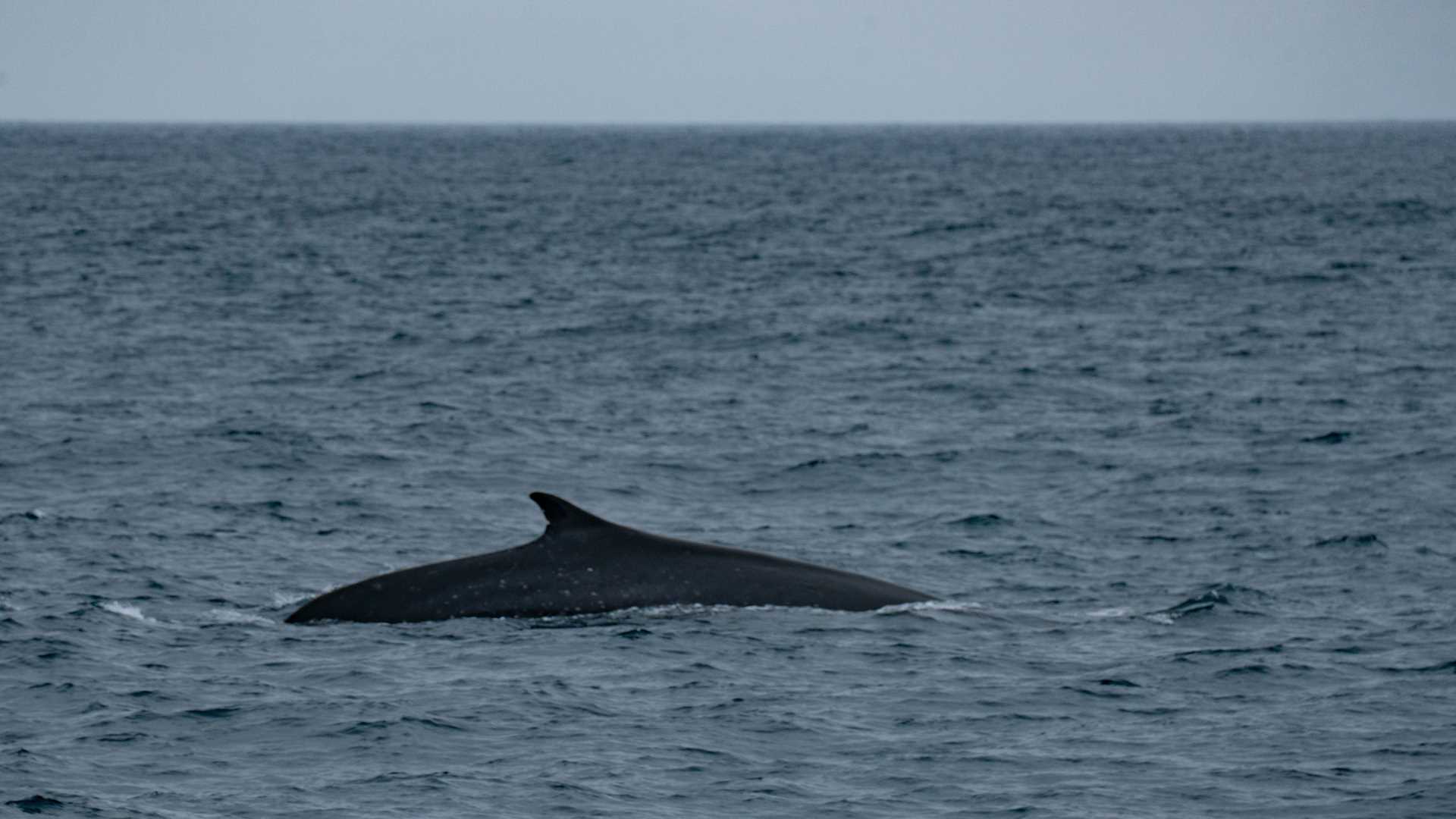 After lunch, we spent time learning from our natural history team about photography and the destinations we will soon be exploring. Just as we were learning about the deep-sea ecosystem from our undersea specialist, an announcement interrupted him mid-sentence: whales ahead! We made record time racing to the bow and outer deck to see our first fin whales of the trip! There were six or more whales feeding near the surface. The tall blows, white right jaw, and sharp falcate dorsal fin made for an easy species ID. This is the second largest whale species in the world, reaching up to 89 feet and weighing a whopping 260,000 lbs. These baleen whales feed by lunging, mouth agape, taking in massive mouthfuls of water and prey (due to our current location, it is most likely that the whales were feeding on krill). They then use the baleen like a sieve to push out the water and selectively keep and swallow the nutrient-dense krill.