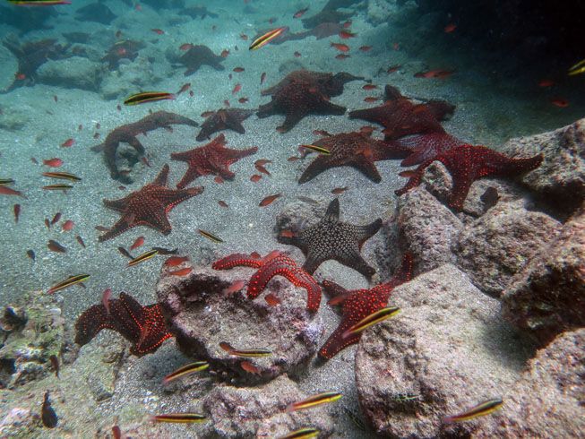 On National Geographic Endeavour II today, we explored Bartolome, home of a small colony of Galapagos penguins. Bartolome is one of the youngest islands, and it is located next to Santiago Island in the central part of the archipelago. After an amazing sunrise, we went ashore for a walk, and we were transported back to a time when the land was newly formed. We began our day by hiking to the top of a tuff cone known as the islet of Bartolome, named after the First Officer of The Beagle . Walking on this young island allowed us to understand the formation and volcanism of the Galapagos Islands. The rocks are a great way to understand the area and its geology. We spotted a few lava lizards and painted locusts, some of the very few animals on this island. As we reached the top, we had a great view. Our guests enjoyed the magnificence of Pinnacle Rock. After we visited one of the most iconic geological formations of the Galapagos, our breakfast was enhanced by dramatic views of the impressive volcanic landscape. We visited the beach near Pinnacle Rock, where we enjoyed how the sun made the sand sparkle due to a concentration of silica. Later, we went snorkeling along the channel between Santiago and Bartolome Islands. Many of our guests spotted whitetip reef sharks and very colorful parrotfish. The landscape was beautiful with lots of sea stars. We enjoyed the chance to be surrounded by Galapagos penguins and feel accepted as part of this environment. After a delicious Mexican lunch, we had lectures on the photography of reptiles and Darwin. Afterwards, we went to Chinese Hat Islet to snorkel from the Zodiacs. The area is home to a small colony of Galapagos penguins. In a sandy-bottomed, sheltered channel, our guests enjoyed swimming with whitetip reef sharks, rays, and many fish. It was a nice and sunny afternoon. After snorkeling, we had the chance to explore the unique, small volcano that formed an island in front of Santiago on a sunset Zodiac ride. After a spectacular day full of activities in the field, we returned on board. Every day in the Galapagos is an opportunity to reconnect with the beauty of nature through unbelievable encounters!