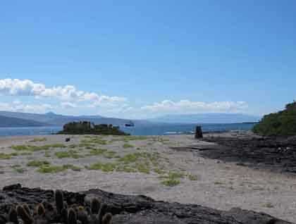 Later today we experienced the productivity of the ocean by snorkeling nearby, at Punta Vicente Roca. We spotted a large group of penguins, several big school of bonitos, many coral and reef fish, and more than two dozen sea turtles. Once out of the water we headed out once more for a Zodiac ride along 1000 foot high cliffs, a big cave, and a beach where we counted more than 20 flightless cormorants.