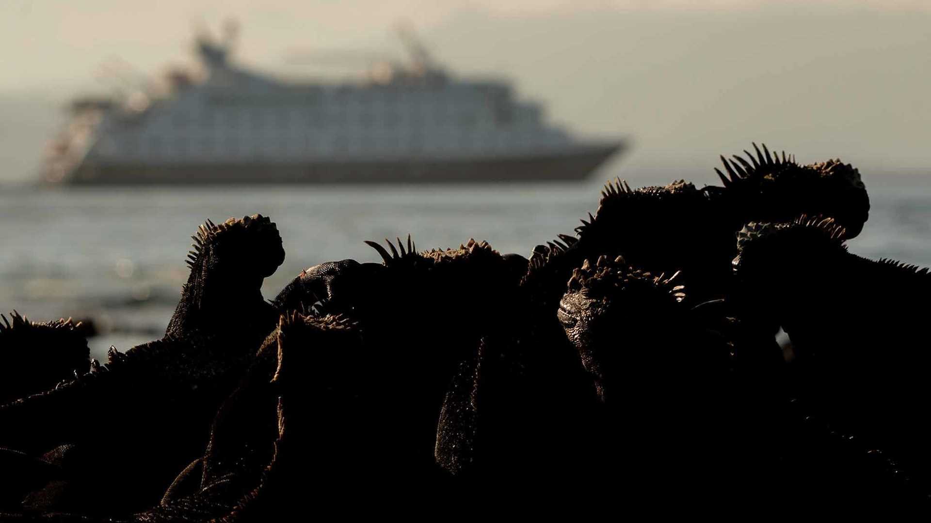 In the afternoon, we set out on the Zodiacs for a sunset cruise around Punta Vicente Roca. This area of Isabela is home to large numbers of resting green sea turtles. Guests also observed blue footed boobies, and Galapagos fur seals, brown noddies, swallow-tailed gulls, and Nazca boobies. We discussed some of the spectacular geological formations of this site, including volcanic ash and dykes. Photo instructors accompanied us on the cruise, offering pointers on how to capture great shots on a moving vessel. We ended the day with a wine tasting celebration on the observation deck as we crossed the equator.