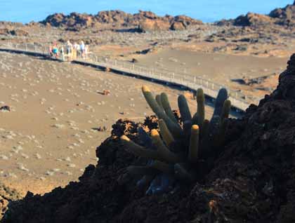 What a wonderful feeling it is to wake up to some magnificent landscapes of shield volcanos leaning over calm seas. We have traveled all night and have reached the western islands of the Galapagos, the most remote and pristine of all. We were accompanied for a short while by a pod of common dolphins, some of which jumped, displaying fantastic acrobatics. Soon we dropped anchor at Punta Espinosa, north of Fernandina. This is the youngest island of the archipelago, and once we set foot ashore we realized how hostile this environment is. There are black basaltic flows all over the place and little vegetation. However, several species have managed to colonize this area, and particularly the marine iguanas seem to do really well here. All along the trail we found dozens of them, if not hundreds, basking in the sun. As their bodies warmed up, many of them started making their way into the ocean to look for the algae that they feed on. A small colony of flightless cormorants also live in this area, a unique species that has traded its ability to fly to become even better divers. Some Galapagos sea lions rested on the sand or played in the tidal pools, and a couple of Galapagos hawks witnessed the whole scenario while perching at the top of some mangrove trees. Punta Espinosa certainly feels like a place out of this world, rather timeless.