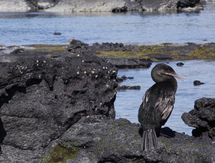 After a long cruise aboard National Geographic Endeavour from the center of the archipelago to most western islands, we anchored at the northeast point of the island of Fernandina, known as Punta Espinoza. Here we had a full morning starting with a dry landing just after breakfast. It was low tide and a large portion of the tidal area was exposed, the green and red algae on the rocks attracted a large number of marine iguanas, the first of the featured animals you want to see here. It is hard to count how many dozen of them line up to feast on the delicious seaweed that the rocks at this tidal area offer them. Marine iguanas were not alone here. Nearby where they were feasting we found cormorants, which in the Galápagos Islands are something rather unique. Flightless cormorants were standing drying their wings and having a little rest before returning to the water for more food. Great swimmers and outstanding divers, the cormorant in Galápagos can stay underwater longer than five minutes looking for octopus, fish, and squid.