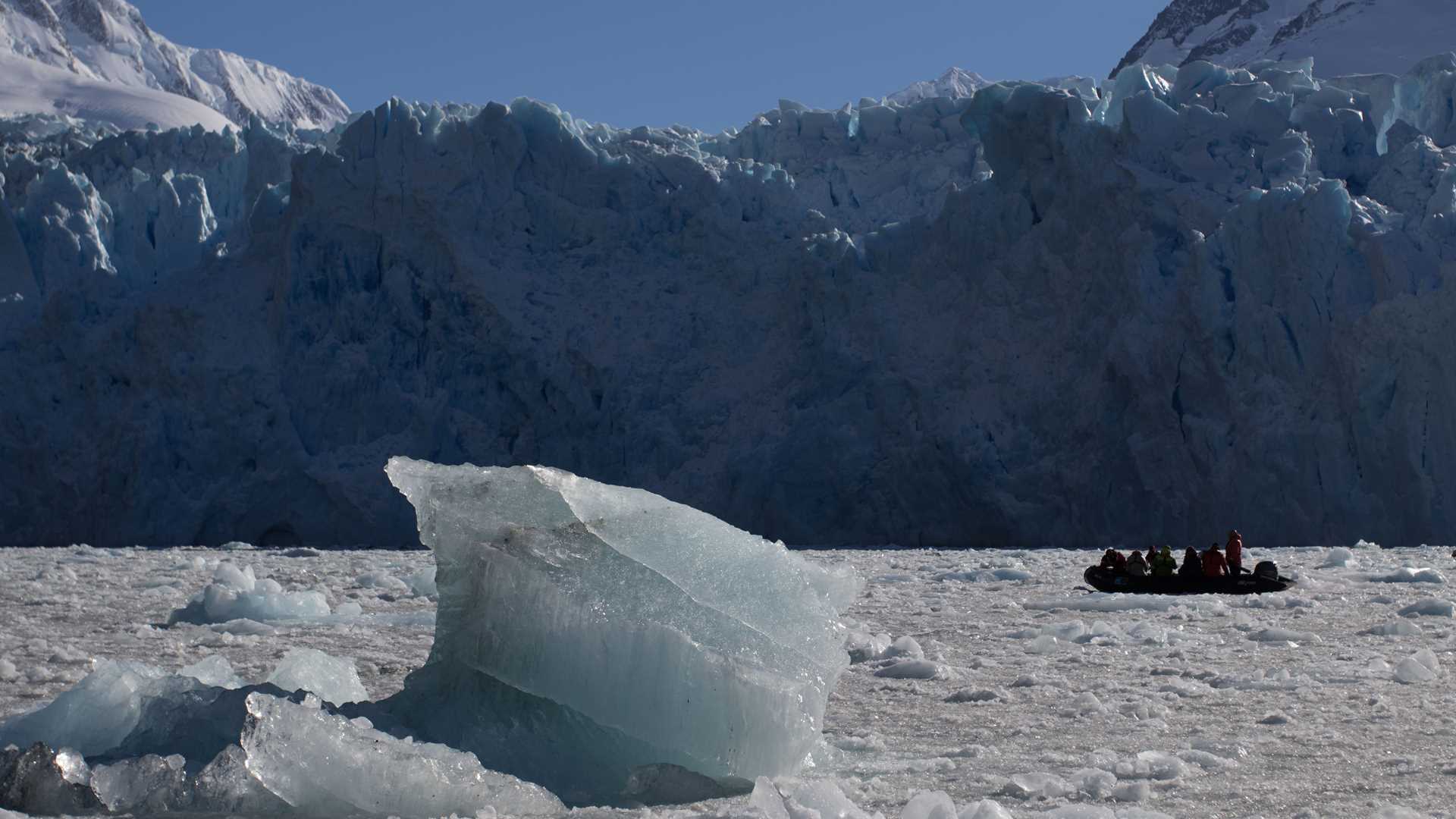 As we continued slowly up the fjord, the amount of ice increased. By the time we could see the distant face of the glacier, the water’s surface was completely crammed with ice. But during breakfast the Zodiacs were lowered, naturalists took to the boats, and off we went, pushing slowly through to a safe distance from the glacier. The day had turned from light fog and overcast skies to totally clear. Topping off the scenery: dramatically rugged mountain peaks and ridges capped by a light dusting of snow.