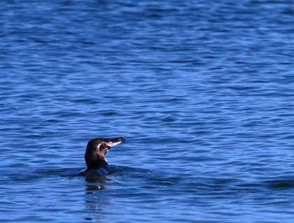 Early in the morning, our ship dropped anchor at Punta Cormorant, north of Floreana Island. Its peaks looked misty and were shrouded by clouds, but there was blue sky and a beautiful sunshine above us. We landed at a beach that contained large amounts of minute olivine volcanic crystals, which gave it a greenish tinge. We soon realized that a couple of Galapagos penguins were busily hunting in the shallows…what a wonderful surprise! Brown pelicans were also attracted to the same school of little fish, as well as a few blue-footed boobies that dove for it with their typical kamikaze style. The local colony of Galapagos sea lions observed all this commotion on the beach, but decided to carry on sleeping on their favorite rocks.