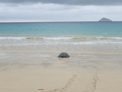 This is why we offer a pre-breakfast activity today, to visit Punta Cormoran. This site is a very important nesting ground for Pacific green sea turtles, and this morning we were able to see the hard effort made by a female turtle to nest on this beach the previous night. We also heard singing male finches, these famous little birds are also going to start breeding very soon.