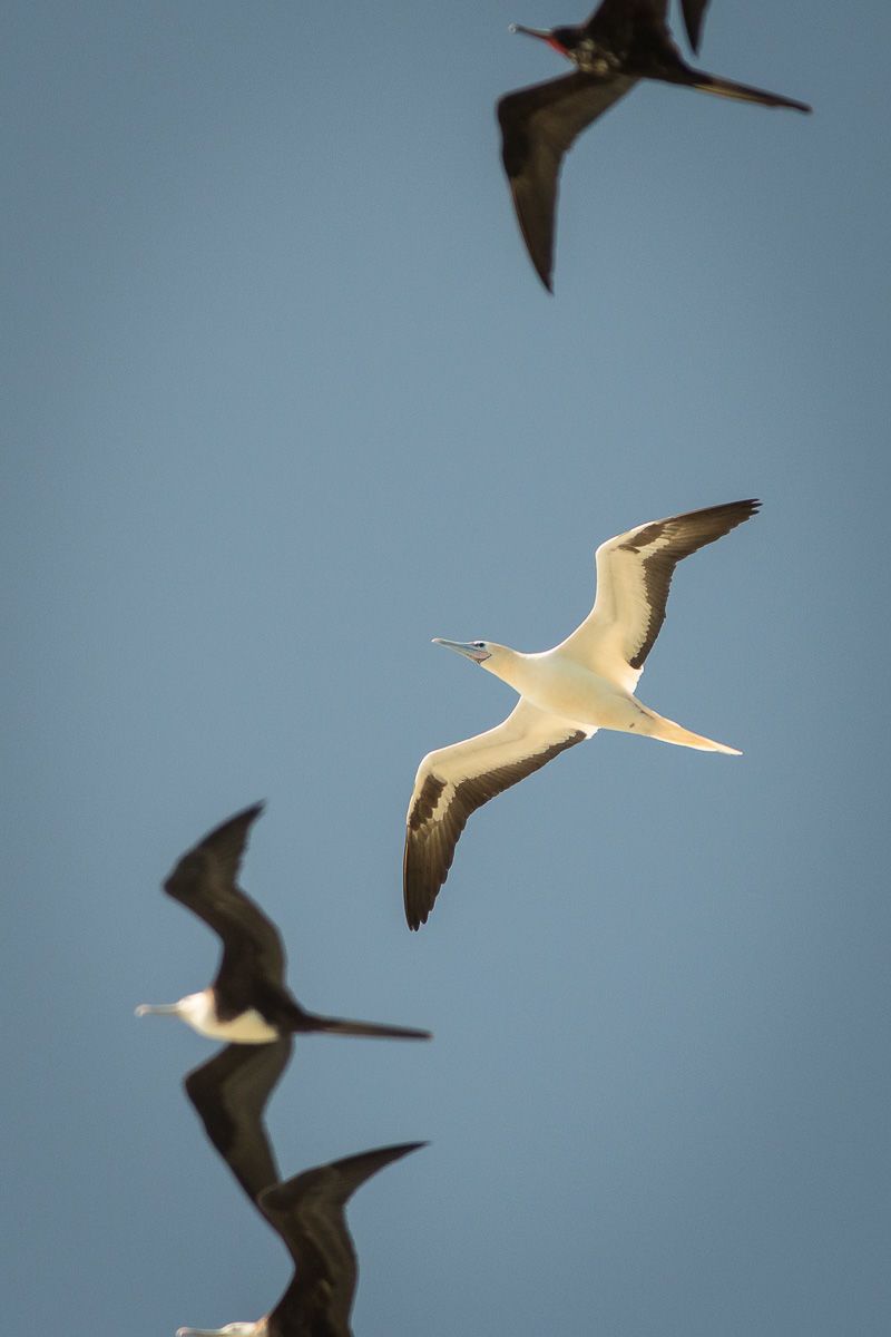 At the beach, there is a very small cliff made of ashes and pebbles from volcanic material; on the top of it, we found many blue-footed boobies nesting and having their rituals to fall in love. It is a very interesting court-ship to watch, in which they show their feet each other and spread their wing off as part of the ceremony. Pelicans also were fishing around, while some frigates very high into the sky were waiting to steal any piece of food. The morning was very productive and then we went back on board to have breakfast. Later we went to explore Champion Islet, place and home of the last dozens of Floreana mocking birds that still surviving in this small landmass; from the main island of Floreana they extinguished many decades ago by the introduction of feral goats that nowadays are not there anymore. To see these creatures is a very hard task but this time we were lucky and we spotted two of them. After our zodiac ride we jumped to the warm turquoise water to snorkel with sharks, sea lions, moray eels, a hundreds of multicolored tropical fishes; the experience of swimming with sea lions is unique; they are so friendly and playful with our intrepid guests that are astonished of having this National Geographic moment at the ocean.