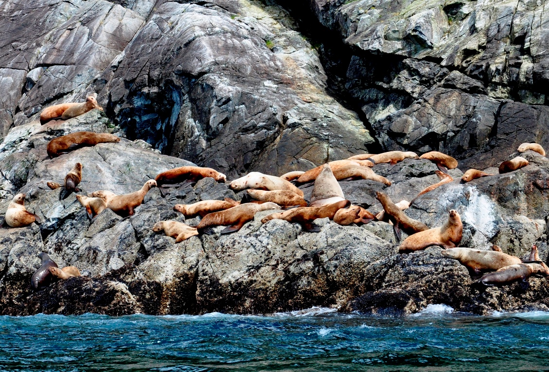 After a short reposition to the Inian Islands, we boarded the expedition landing crafts for an adventurous cruise amongst the small islands in search of more marine mammals. When the tidewaters from the Pacific reach full ebb or flood in this area, the waters churn and froth, confusing the fish and make opportunities for the resident Stellar sea lions and bird life to find a meal. It wasn’t long before we encountered the huge beasts (some males approach 2,000 lbs.) as they caught and devoured fish in the whirlpool waters between the islands. Many eagles and gulls could be seen waiting their turn at the bounty once the sea lions were done consuming their prey. A lone humpback whale also plied the waters heading west in search of smaller fish during the long summer days of productivity. A few sea otters were also seen searching for a meal in between bouts of preening to keep their fur buoyant and insulating.
