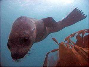 We go on with filming the kelp until I catch a snatch of motion, a shadow at the side of my eye. About twenty feet away and slightly above us there are at least two dozen seals doing spins, flips and dives! There are females, youngsters and one large male. Even in their exuberance they remain as a group, like performers on a great stage, their rapid motions a dance, each animal with its own steps and time. The females dart left and right, up and down, the juveniles make cautious arcs and swift retreats, and the male waltzes with ponderous, side to side movements, slow, majestic and powerful.