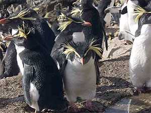 This morning at first light we picked up our guides from Edinburgh on Tristan da Cunha and sailed south for the two islands in the Tristan Group which we had yet to visit. After breakfast we arrived at Nightingale Island. The sky cleared into a beautiful morning as we lowered the Zodiacs to go ashore. The island is a nesting site for yellow-nosed albatross, the mosleyi sub-species of the rockhopper penguin (pictured) and hundreds of thousands of greater shearwaters and ground nesting petrels. We encountered the rockhopper penguins on the rocks at the landing site and climbed through the tussock grass to the nests of the Yellow-nosed albatross. On the beach and in the water we were surrounded by sub-Antarctic fur seals, mostly very curious pups. Zodiac cruises along the volcanic coastline revealed caves and arches waiting to be explored. We experienced perfect weather and calm seas for our morning ashore—a magical experience in all.