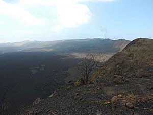The round trip took us around four and a half hours. We drove through the agricultural zone forest on a bumpy cinder road and then hiked along a dusty trail to the rim of the volcano. During the first half hour of our hike, we were blanketed by a kind of mysterious blowing fog. But as we reached the rim, the sun came through and then we could observe the giant caldera of Sierra Negra which is ten by seven kilometers in diameter.
