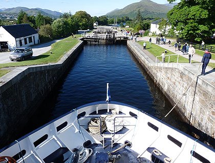 Bright sunshine catapults us out of our beds. After breakfast some of us just want to enjoy the great weather and warmth on the front deck, whilst the ship is sailing down Neptune’s staircase. This is a series of 8 locks, lowering the water level over the space of 500 yards by 70 feet. An amazing feat of engineering, particularly impressive as this was also constructed, like the rest of the Caledonian Canal, in the early 19th century.