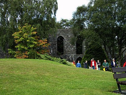 By the time everyone made it up to the spectacular look-out post known as McCaig’s Folly, the sun was such that glasses and hats were donned, and coats removed. Technically named McCaig’s Tower, this is a construction that hails from 1897 when John Stuart McCaig hired out-of-work stonemasons to create employment, and ended up with a structure that resembles the coliseum of Rome. Some family members thought it a waste of money, but the town of Oban has adopted it as its own, and it provides the ideal walking destination for an overview of the entire harbor and nearby islands.