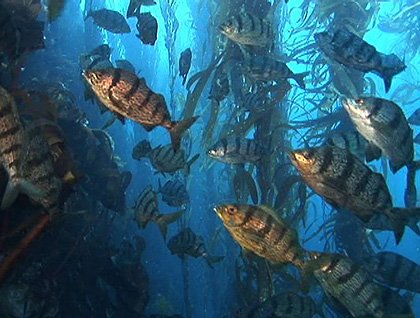 Beneath the bright sunlit surface of the sea, the marine life reflects and enlarges these themes. At Tristan we looked again into kelp forest, as we did in the Falklands and South Georgia, but new species of kelp have appeared while others begin to drop out. Large shoals of fish, absent in the Antarctic, flit through the watery gardens here, and some of them, like the Tristan wrasse (Nelabrichthys ornatus), herald the tropical communities we will soon encounter at Saint Helena and Ascension Island.