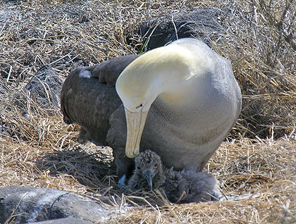 As we advanced on the bouldery trail, we got to the place where, year after year, the Galápagos hawks build a nest; an adult hawk was feeding two tiny newly hatched chicks with a baby marine iguana freshly hunted from the nearby rockeries. Galápagos hawks have a polyandric social arrangement and the females are the dominant ones; the males help them find food for the offspring.