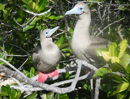 The white coralline beach with red mangroves is where we started our walk today; the red mangroves are the nesting place for most of the red-footed boobies found on Darwin Bay. Due to the heat, male frigatebirds had their pouches half-way inflated, but that did not stop them from calling for the attention of the difficult females that flew around them without even looking at them.