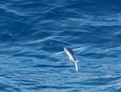 And we can find many excellent subjects for our cameras. Guided by Mike and Kent, we shoot sunrises and sunsets, sometimes even the green flash, an optical phenomenon that we have all become quite familiar with under Jim’s tutelage. Then there is the flying fish challenge. These remarkable creatures seem to be by far the most common wildlife in these blue desert latitudes and several of us have taken up the difficult task of capturing them with a shutter. We have encountered three species in recent days, some hard to photograph and others nearly impossible.