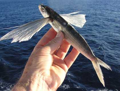 Now we have set course 311° for Ascension, 700 miles to the NE. The sea is a deep (2000 fathoms deep) ultramarine, the sky pristine azure, distant flotillas of clouds sailing along the horizon in company with us. The whole ocean is urging us on: running north before SE trades, drifting north with the subtropical current and surfing north on long swells from windier latitudes behind us. Sadly, hurtling north at 12 knots, we did run over this flying fish, found on the foredeck.....but have seen many more skittering out of our path, singletons banking away like tiny gliders, occasionally a whole "flock" bursting from the sea, scattering to leeward like startled birds. From Antarctica, where the birds swim, we have reached the tropics, where fish fly.