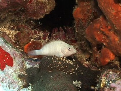 Instead there are rocky reefs, formed from the craggy lavas that built the island and now largely encrusted with beautiful miniature stalagmites of coralline algae, like sandcastles for tiny fairies. Among these live some of the rarest fish in the world; Ascension’s reefs support a large number of endemic species, some found only here and others shared with Saint Helena, the island’s nearest neighbor. The pretty little white hawkfish (Amblycirrhitus earnshawi), which lives nowhere else in the world, is unique in the pale coloration that allows it to blend in with the pinkish white coralline algae, a wonderful example of a colonist species adapting to its new home.