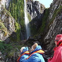 Those unwilling to make the climb set in for a Zodiac cruise around Godthul’s impressive shoreline. Fur and elephant seals, gentoo and king penguins, and an assortment of seabirds dotted the fractured shores. All animals occurred singly or in small groups, as if in seclusion from, or banished to the distant edges of, their own colonies. Two species of large brown kelp, Durvillea and Macrocystis, guarded the shores’ inner reaches. Fresh water cascaded gently in spots from snow packs or small lakes on high, enlivening the rock faces with streaks of lush, verdant mosses. As our requisite time period drew nigh, almost on cue, the winds once again began to howl. In minutes they were in full fury, driving our ship’s anemometer to spin wildly over 70 knots. Through a pelting maelstrom of thick chop and horizontal spray we returned from shore and Zodiac cruising to the protective womb of our mother ship.