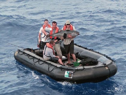 Seamount, and deployed the ROV to see what sort of fauna we could find at 70 meters on its summit. David Cothran, our undersea specialist reported a wonderful variety of sea life on the seamount. While the ROV was sampling the seamount, our galley staff took another Zodiac in search of fish in the waters nearby. They succeeded in catching a 40-kilo wahoo and a yellowfin tuna of comparable size and they hooked another even larger fish which they were unable to land, for after a long and valiant struggle the line parted and the fish escaped. We all watched from the bow as this monumental struggle played itself out, and later at dinner, enjoyed the fish that they had landed while enjoying stories of the one that got away.