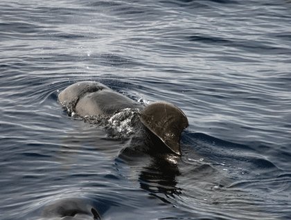 The balmy calm glassy seas are ideal for spotting wildlife over the enormous expanse of the North Atlantic, which stretches endlessly in every direction; and those up early are rewarded with flying fish and bird sightings as the sun rises. A little later Short-finned Pilot Whales and Rough Toothed Dolphins are spotted, and we are all treated to very close views of these mammals as they continue unperturbed by our approach with their business. Their short blows are clearly audible to us, even with all the motor drives hammering away as the photographers attempt to get that pin sharp image, and their bodies glisten in the morning light. The pilot whales must number some 30 to 35 individuals and the dolphins five. The pilot whales surface randomly at regular intervals and, in contrast, the dolphins do so either together or in reduced numbers in synchronized fashion.