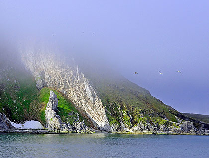 Bellsund constitutes the common mouth of Van Mijenfjord and Van Keulenfjord. This is an area of great ecological richness due to varied geology as well as a relatively favourable local climate. The area is renowned for its rich birdlife, including resting grounds for huge flocks of migrating Arctic geese. As we were waiting for the fog to lift, large numbers of guillemots rushed over our heads, fetching and carrying food for chicks in the nesting cliffs of Midterhuken.